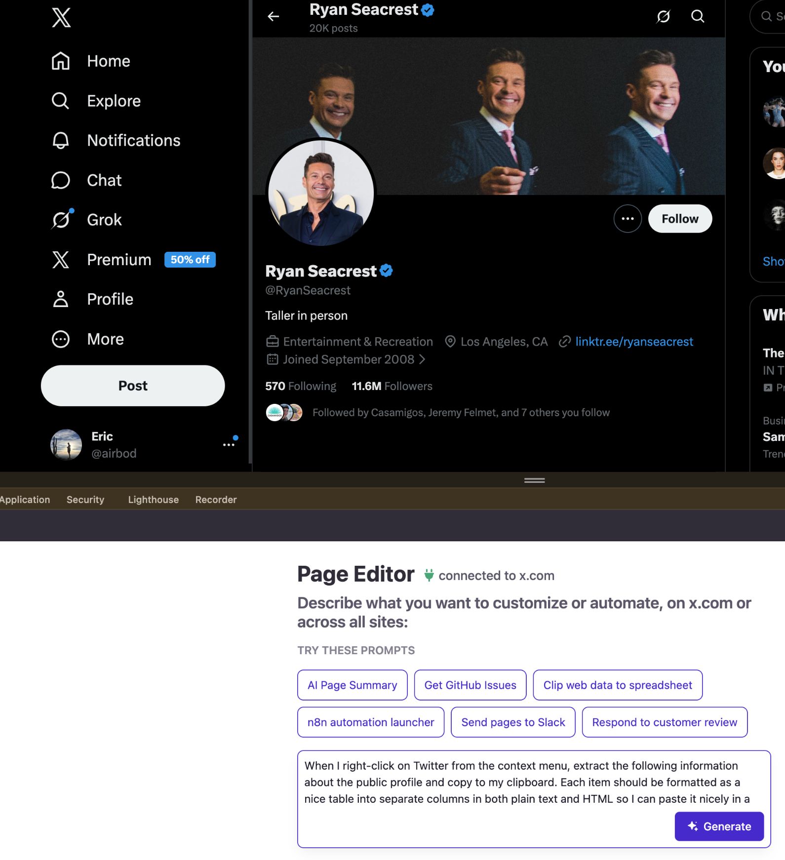 With PixieBrix's AI Page Editor, you don't need to know how Twitter structures its React component tree, which GraphQL endpoints power which page elements, or how to handle Twitter's guest token binding. You navigate to a public Twitter profile in your browser, describe what you want to extract, and the AI builds a working extractor - right there, against the live page. No setup. No maintenance contract. No $5,000 monthly API bill.