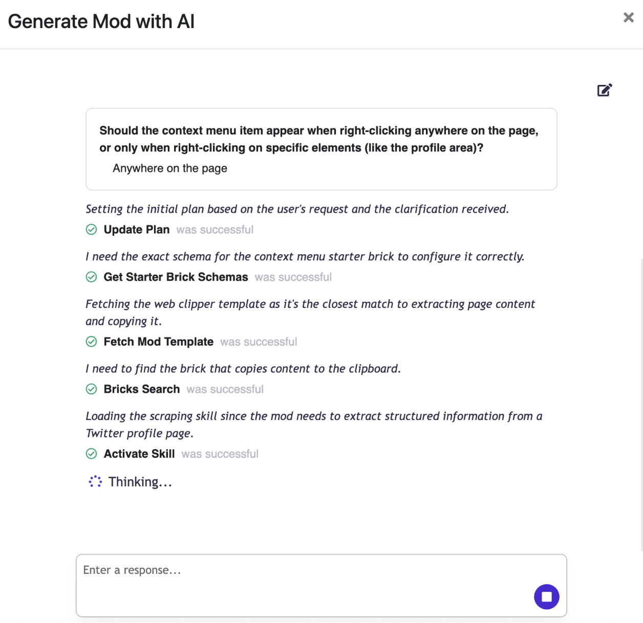 After submitting your prompt, PixieBrix's AI analyzes the current Twitter page structure and generates the complete mod - trigger, extraction logic, data formatting, and clipboard output - all wired together automatically.