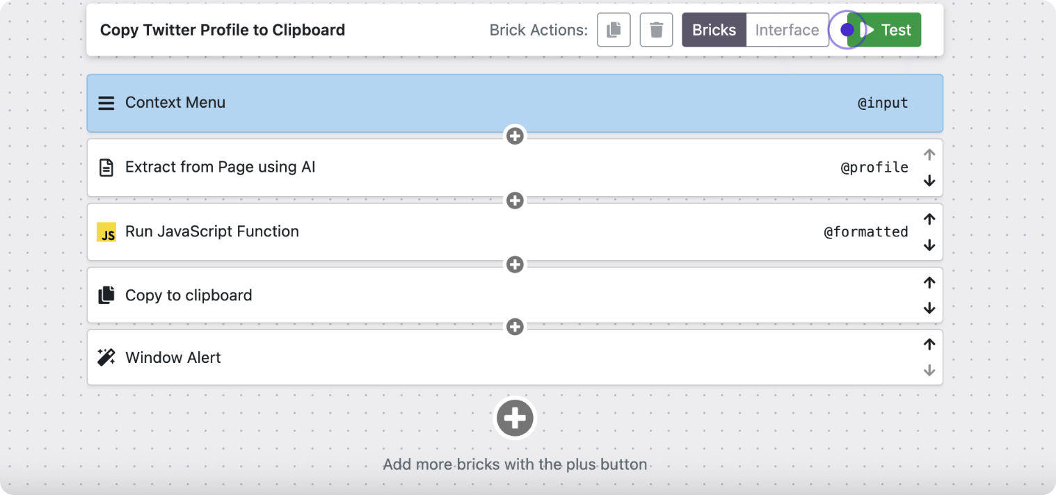 The building blocks of every mod are called bricks - pre-made components for extracting HTML, transforming data, calling APIs, and writing output wherever you need it. You configure them visually, and the result runs inside your browser tab in real time.