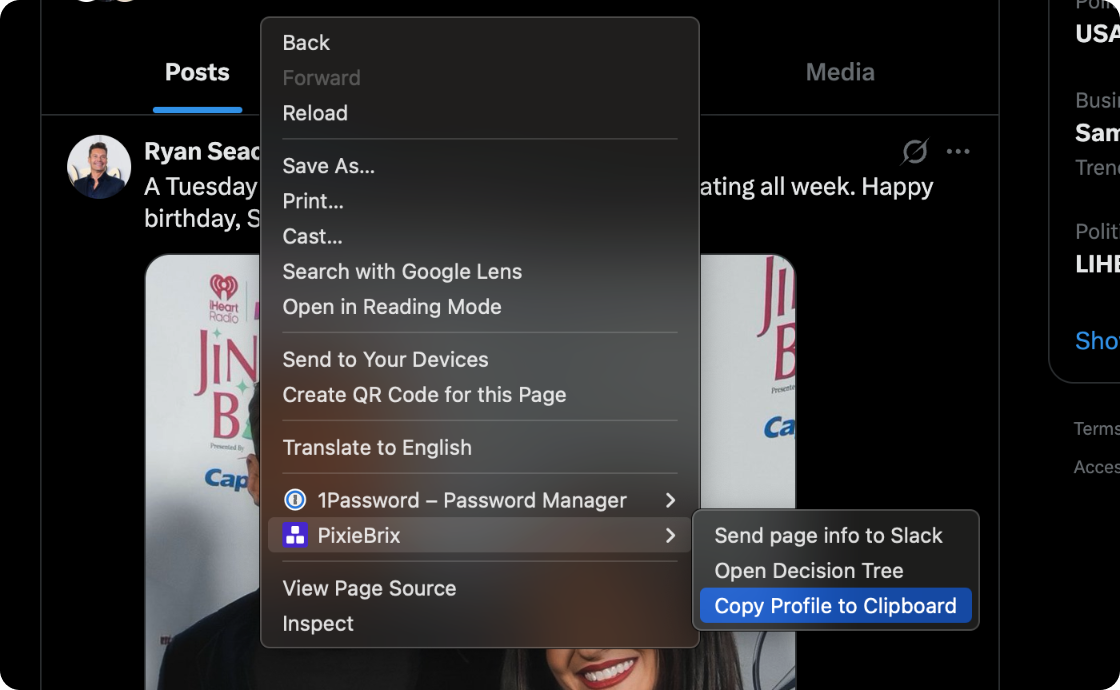 From here, navigate to any public Twitter profile and right-click anywhere on the page. Select "Copy Twitter Profile to Clipboard" from the context menu - PixieBrix extracts all ten fields in real time and surfaces a small popup with a single "Copy text" button. Click it, and the formatted table is on your clipboard.