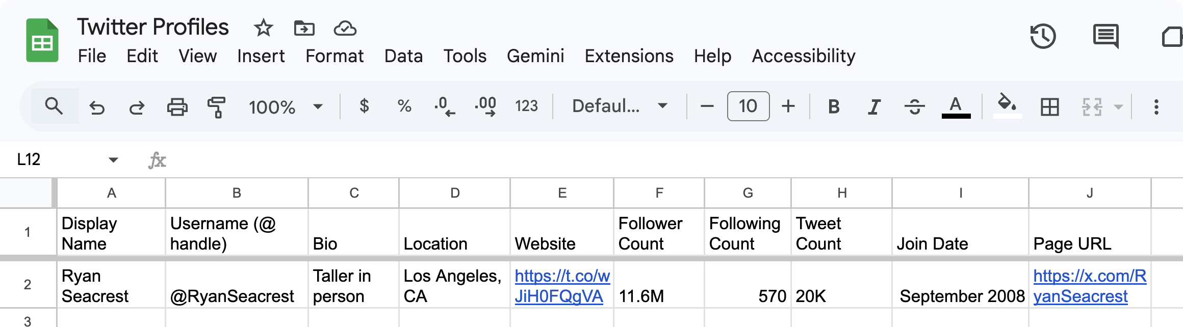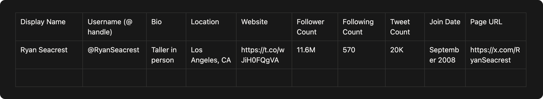 In Google Sheets: Click into the first empty cell in your target row and hit Cmd+V (Mac) or Ctrl+V (Windows). All ten fields - Display Name, Username, Bio, Location, Website, Follower Count, Following Count, Tweet Count, Join Date, and Page URL - paste across individual columns automatically. Keep a running Google Sheet open in a pinned tab and paste after every profile you research. Building a competitor monitoring list or prospect database takes minutes.