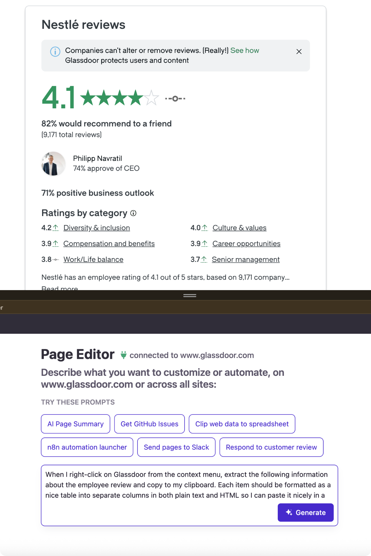With PixieBrix's AI Page Editor, you don't need to know how Glassdoor structures its review markup or which nested div holds the "Pros" text versus the "Cons" text. You just say: "extract the star rating, pros, cons, reviewer job title, and review date from this Glassdoor review" - and the AI does the selector hunting for you. If it gets something wrong, you describe the correction. You're steering, not building.