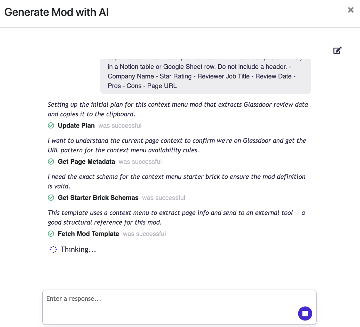 After you send the prompt, PixieBrix's AI reads it, analyzes the Glassdoor page structure, and generates the entire mod for you - trigger, extraction logic, formatting, and clipboard output, all wired together automatically. No configuration required on your end.