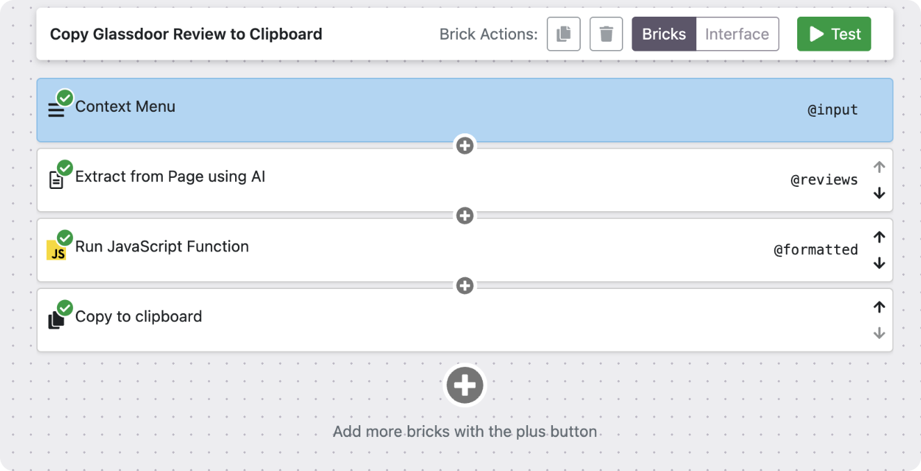 The building blocks of every mod are called bricks - pre-made components for things like extracting HTML, transforming data, calling APIs, and writing output to a Google Sheet or clipboard. You snap them together like Lego, configure them visually, and the result runs inside your browser tab.