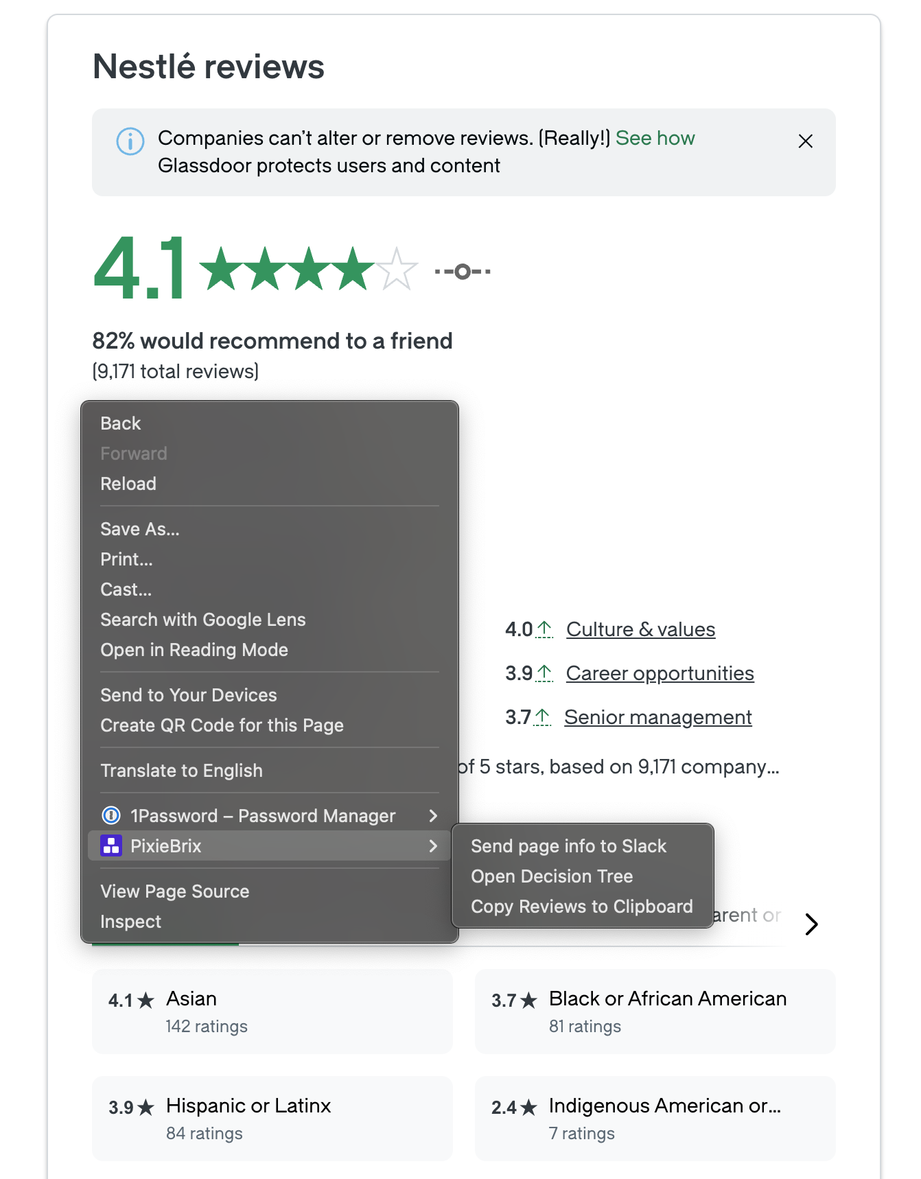 - Context Menu - the trigger. PixieBrix registered a new right-click option that fires the mod when you're on a Glassdoor review page.
