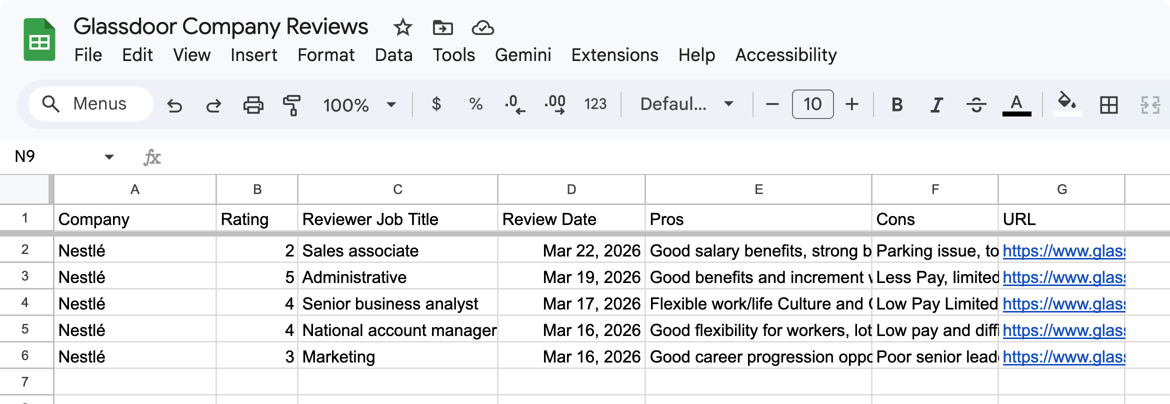 In Google Sheets: Click into the first empty cell in your target row, then hit Cmd+V (Mac) or Ctrl+V (Windows). The data will paste across seven columns automatically - Company Name, Star Rating, Reviewer Job Title, Review Date, Pros, Cons, and Page URL each land in their own cell. If you're building a competitive intelligence tracker or an employer branding audit, just keep a running sheet open in a pinned tab and paste after every review you read.