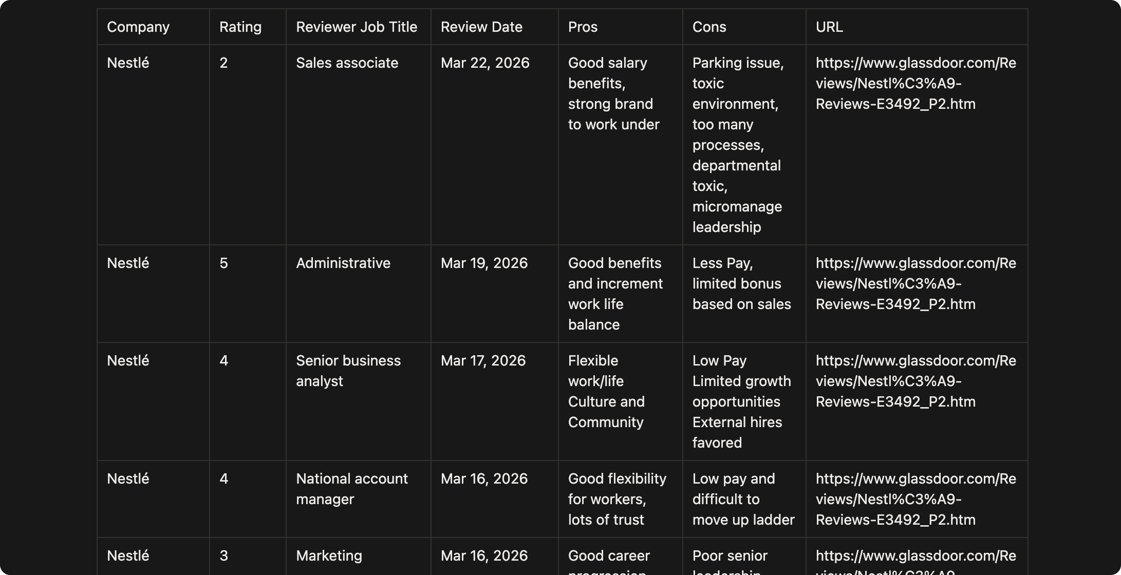 Glassdoor reviews are one of the most honest datasets on the internet. Current and former employees saying exactly what they think about culture, leadership, compensation, and work-life balance - unfiltered, in their own words. Whether you're a recruiter trying to understand why candidates are ghosting you, a job seeker vetting a potential employer, or a product marketer building a competitive intelligence file on a rival company, Glassdoor review data is invaluable.