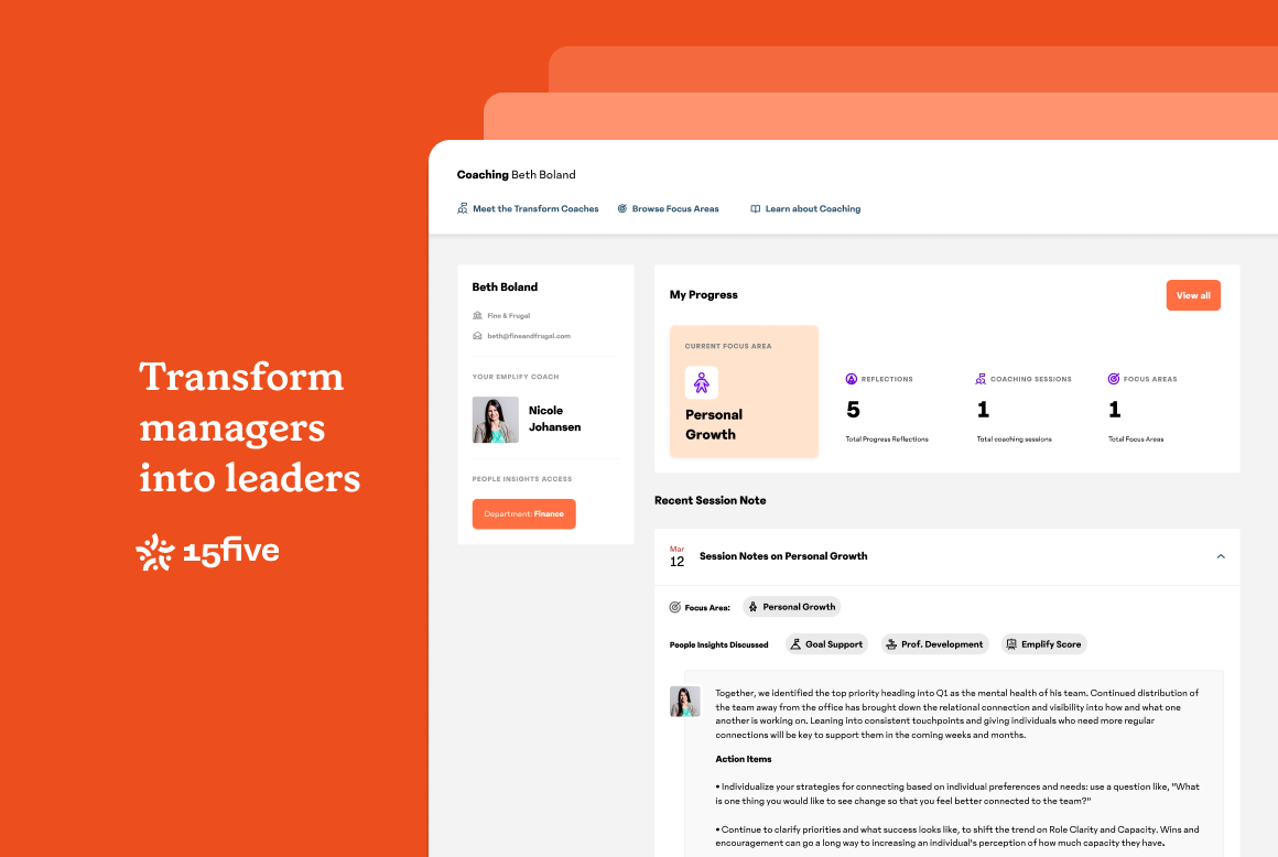 15Five is a performance management and employee engagement platform built around weekly check-ins, OKRs, and continuous feedback. Its Gusto integration syncs employee data so HR teams don't have to maintain two separate employee rosters. When someone is added or updated in Gusto, 15Five reflects the change - keeping performance cycles and engagement data tied to accurate employee records.