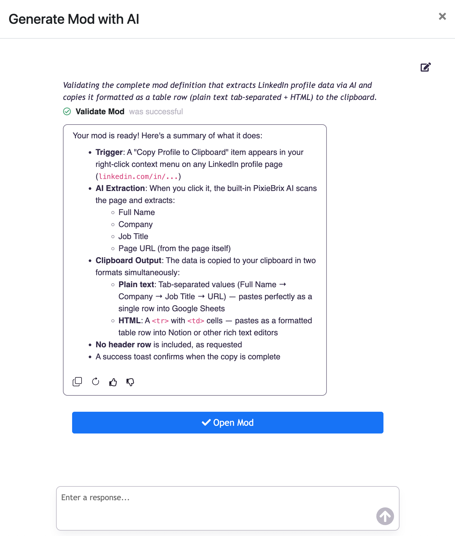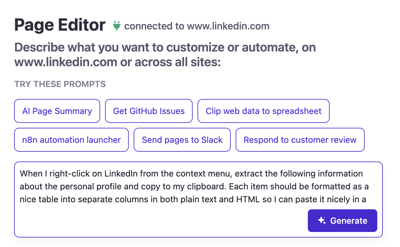 Once it's built, you can review what was generated in the Page Editor if you want to inspect or tweak anything. But for most users, you can go straight to using it: navigate to any LinkedIn profile, right-click, select your new mod from the context menu, and the extracted data is instantly on your clipboard - formatted as a clean table, ready to paste into Notion, Google Sheets, or wherever your workflow lives.