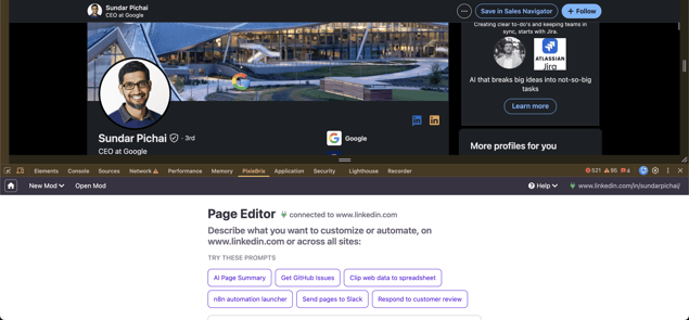 Once installed, navigate to any LinkedIn profile. Then open the PixieBrix Page Editor - you can access it through the PixieBrix toolbar icon or via Chrome DevTools. You'll see the editor open alongside your active tab.