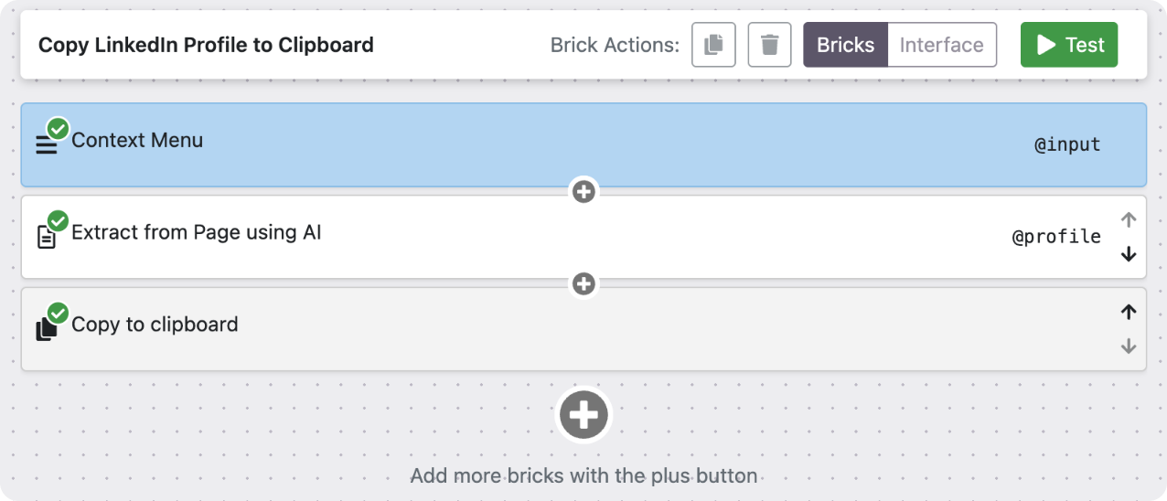 The building blocks of every mod are called bricks - pre-made components for things like extracting HTML, transforming data, calling APIs, and writing output to a Google Sheet or clipboard. You snap them together like Lego, configure them visually, and the result runs inside your browser tab.