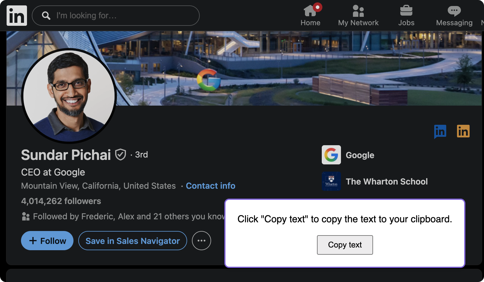 From here, navigate to any LinkedIn profile and right-click anywhere on the page. Select "Copy LinkedIn Profile to Clipboard" from the context menu and PixieBrix will extract the profile data in real time. A small popup appears directly on the page with a single "Copy text" button - click it, and the formatted table lands on your clipboard, ready to paste into Notion, Google Sheets, or wherever your workflow lives.