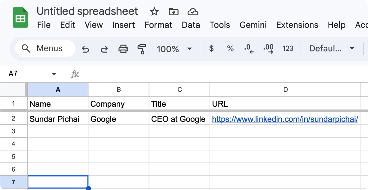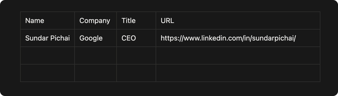 In Google Sheets: Click into the first empty cell in your target row, then hit Cmd+V (Mac) or Ctrl+V (Windows). The data will paste across four columns automatically - Full Name, Company, Job Title, and Page URL each land in their own cell. If you're building a prospecting list, just keep a running sheet open in a pinned tab and paste after every profile visit.