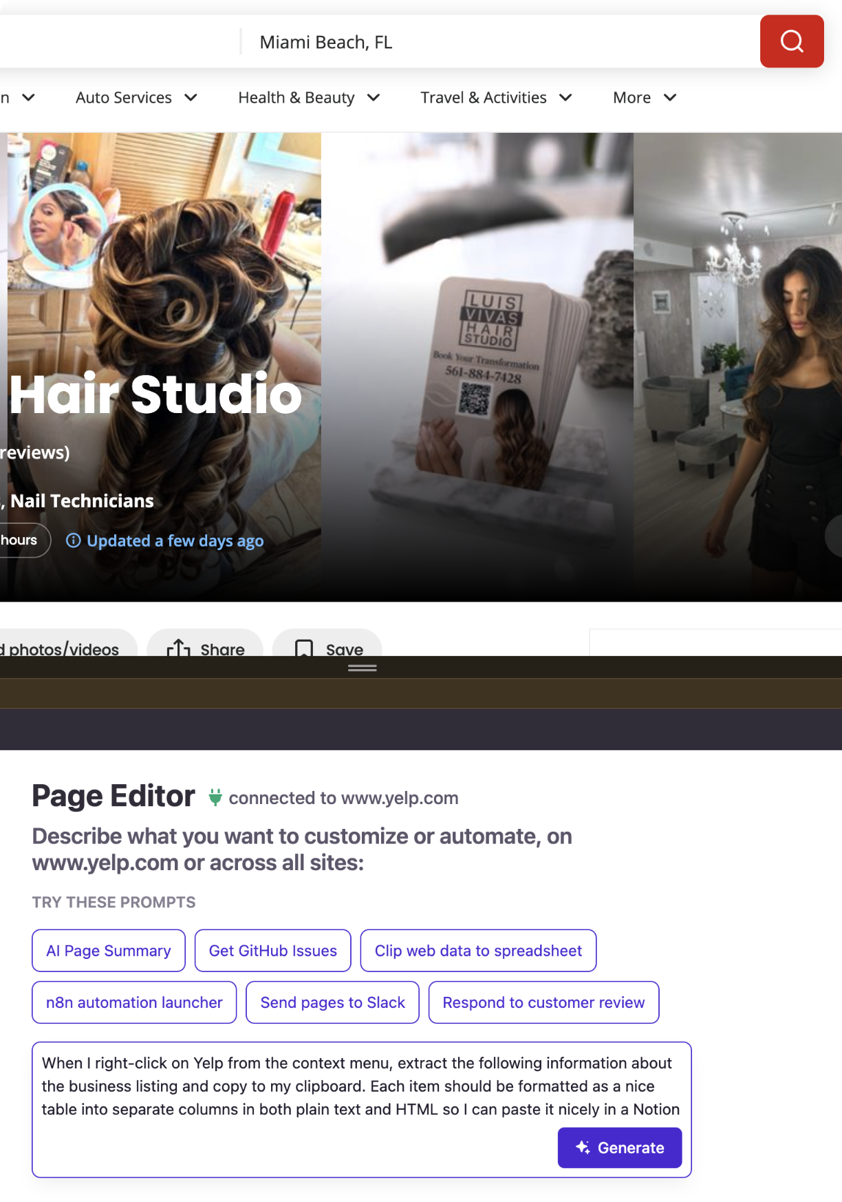 Open PixieBrix's Page Editor on any Yelp business listing, paste the prompt below, and your Yelp business scraper will be built in seconds: