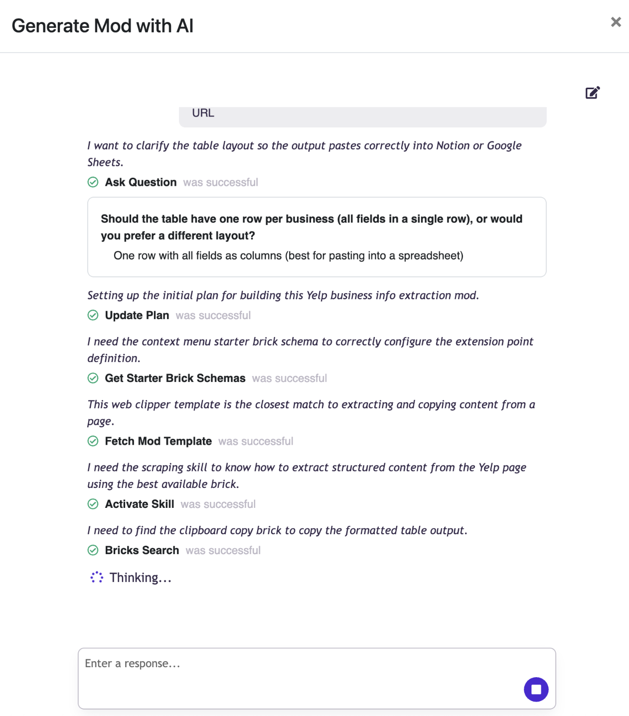 After submitting your prompt, PixieBrix's AI analyzes the current Yelp page structure and generates the complete mod - trigger, extraction logic, data formatting, and clipboard output - all wired together automatically. No configuration required on your end.