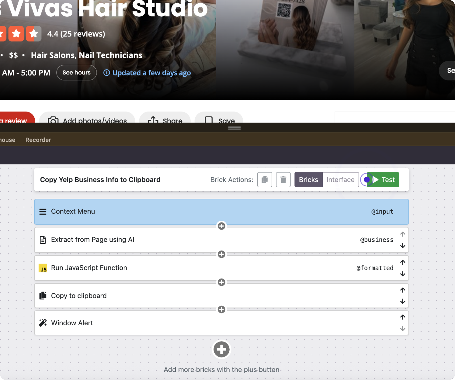 Here's the full build - from a blank PixieBrix setup to a working Yelp scraper that copies structured data to your clipboard on demand.