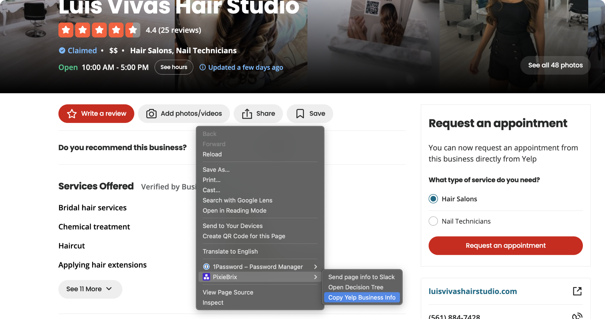 - Context Menu - the trigger. PixieBrix has registered a new right-click option that fires the mod whenever you're on a Yelp business listing page.