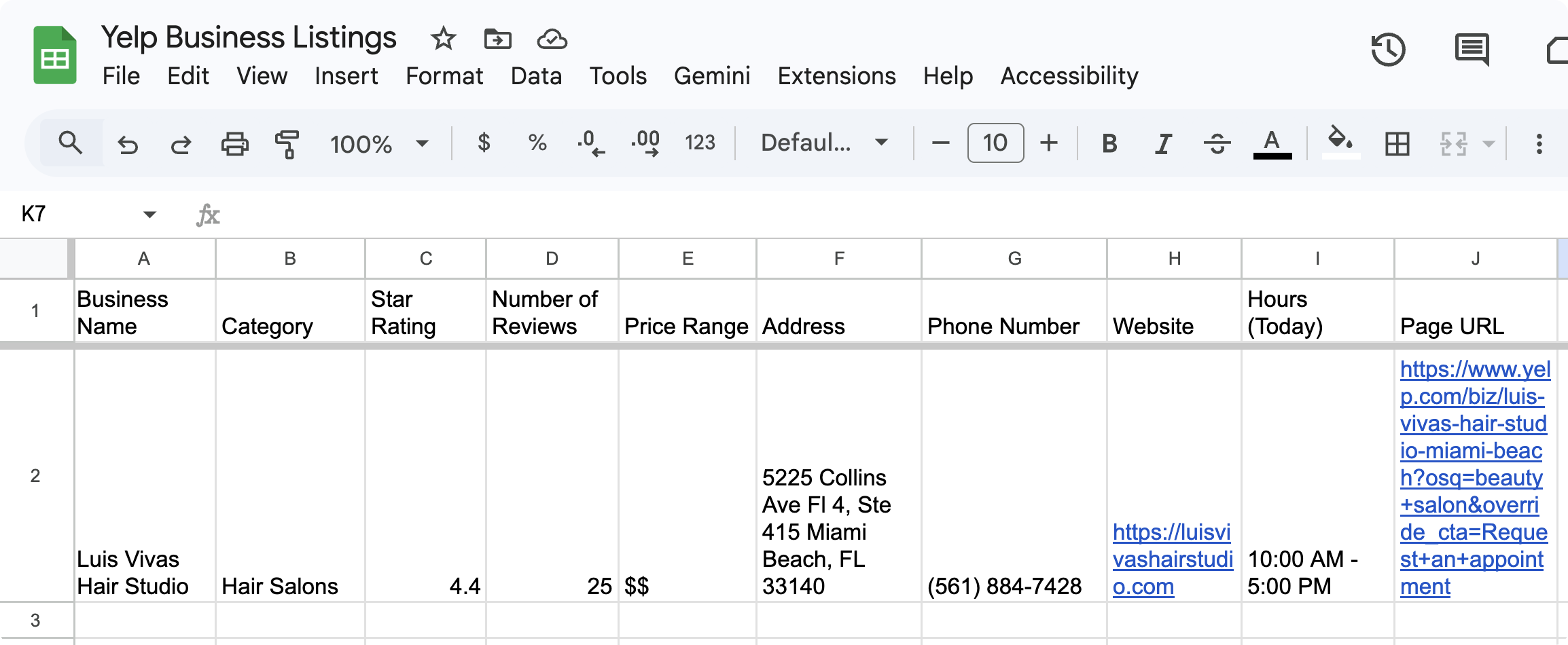 In Google Sheets: Click into the first empty cell in your target row and hit Cmd+V (Mac) or Ctrl+V (Windows). All ten fields - Business Name, Category, Star Rating, Number of Reviews, Price Range, Address, Phone Number, Website, Hours (Today), and Page URL - paste across individual columns automatically. Keep a running Google Sheet open in a pinned tab and paste after every business listing you research. Building a hundred-row prospect or competitor database takes minutes, not hours.