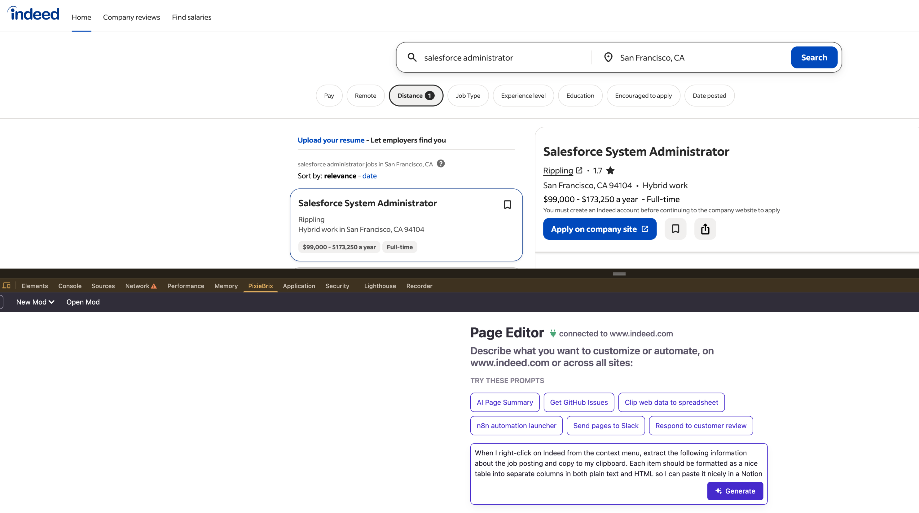With PixieBrix's AI Page Editor, you don't need to know how Indeed structures its job posting markup or which data- attributes map to which fields. You just say: "extract the job title, company name, location, salary range, and URL from this job posting" - and the AI does the selector hunting for you. If it gets something wrong, you describe the correction. You're steering, not building.