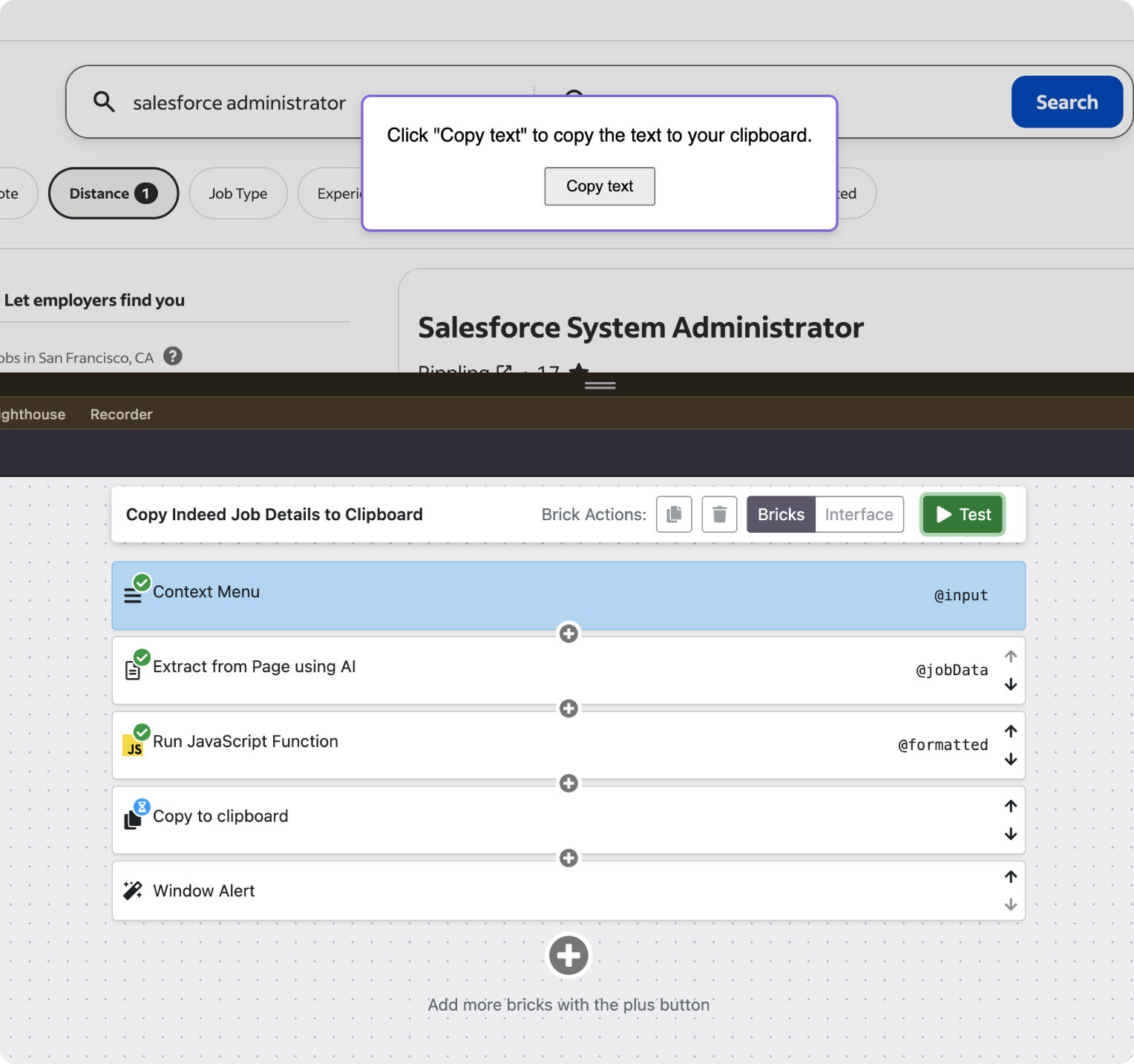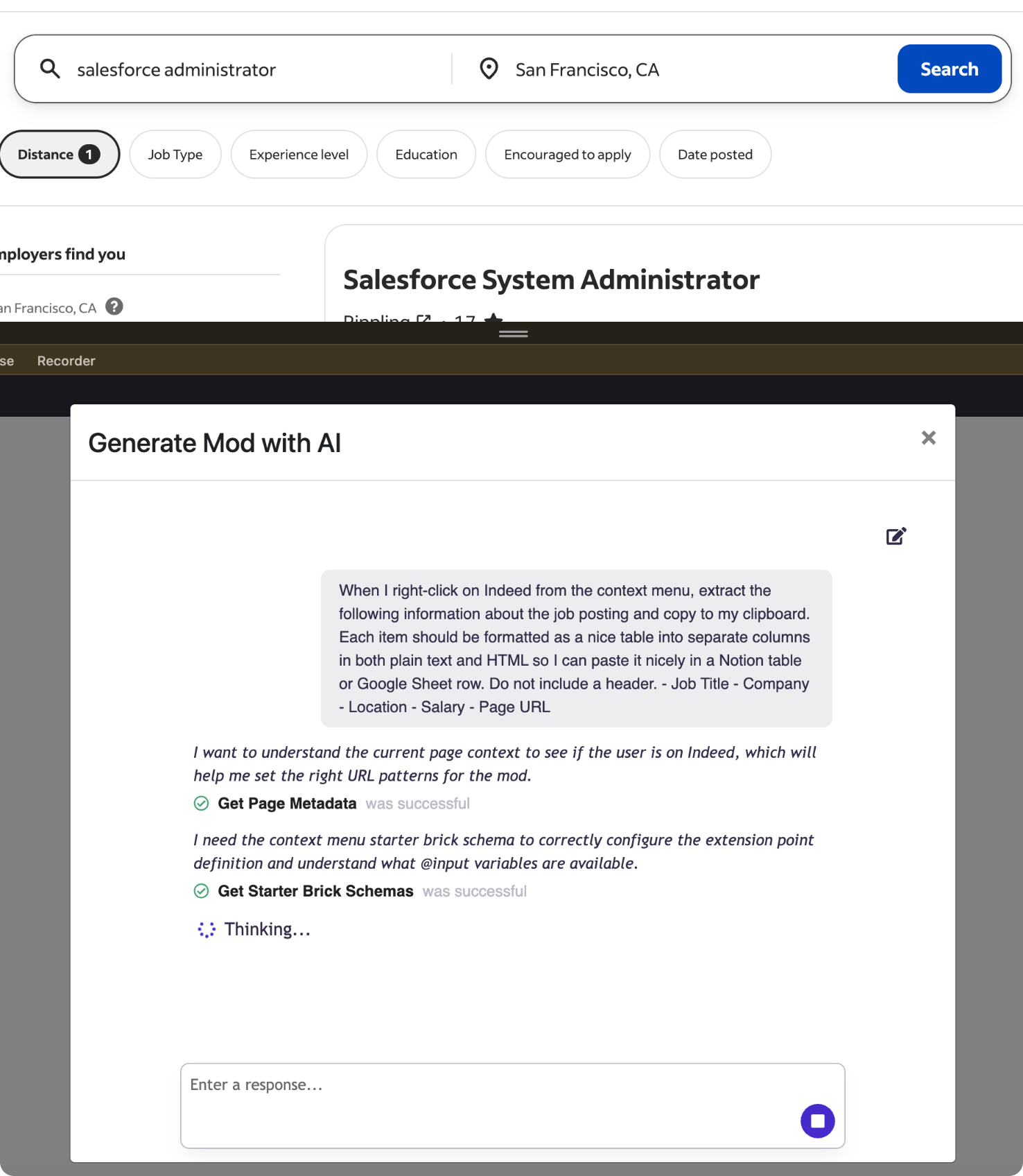 That's the whole thing. One prompt, one built mod, one click to copy any Indeed job posting into your workflow.