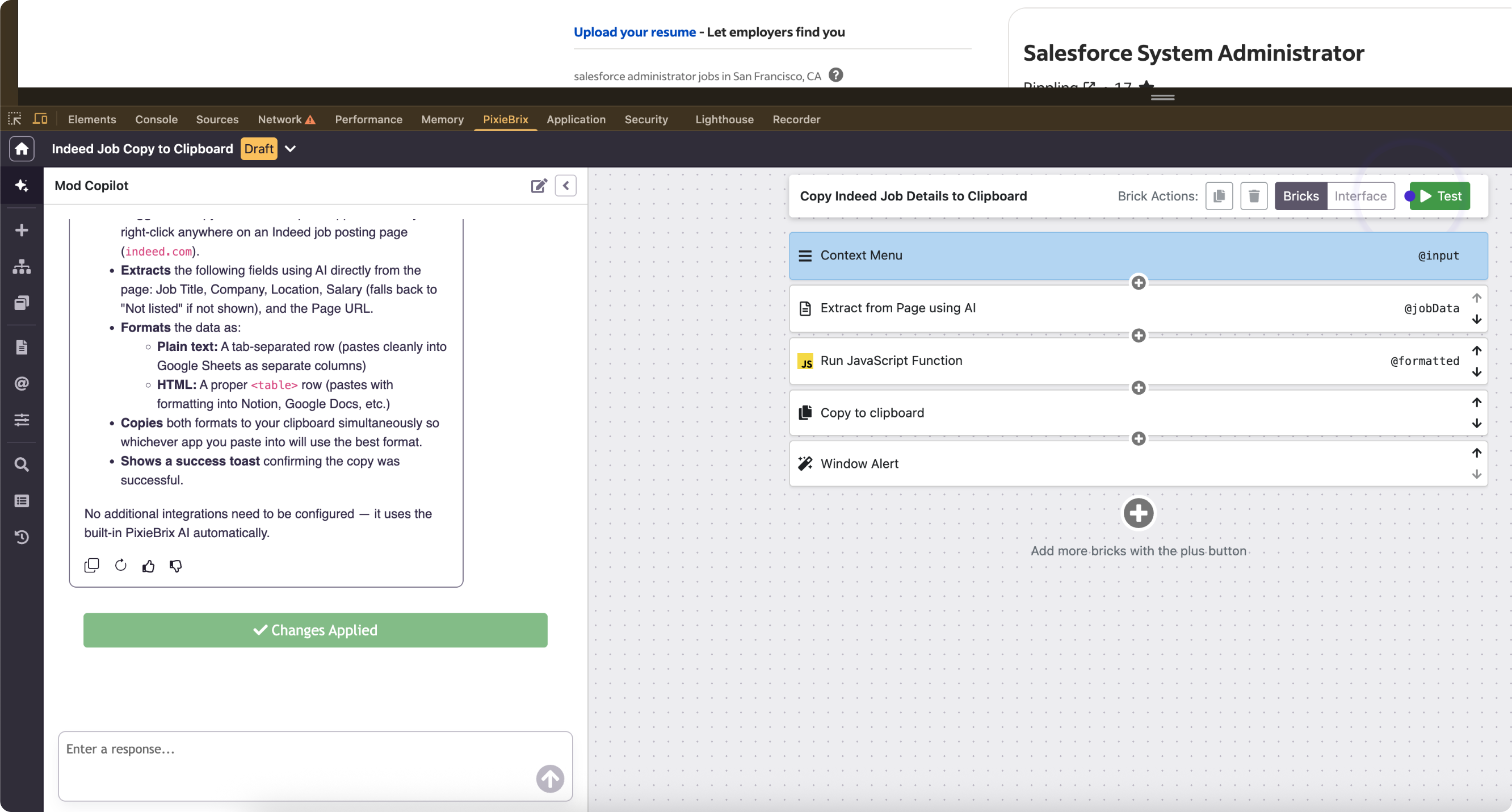 After you send the prompt, PixieBrix's AI reads it, analyzes the Indeed page structure, and generates the entire mod for you - trigger, extraction logic, formatting, and clipboard output, all wired together automatically. No configuration required on your end.