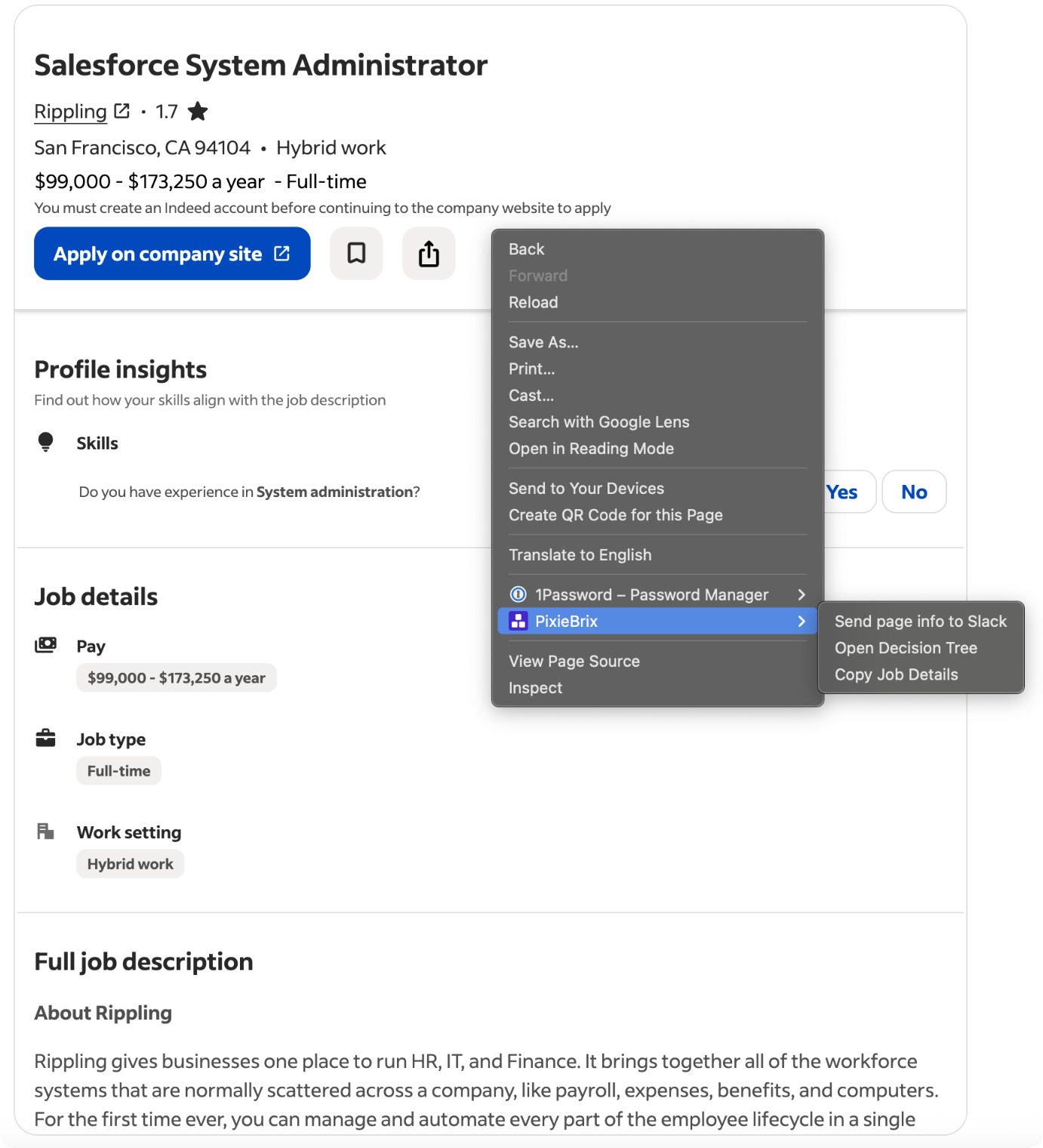 - Context Menu - the trigger. PixieBrix registered a new right-click option that fires the mod when you're on an Indeed job posting page.