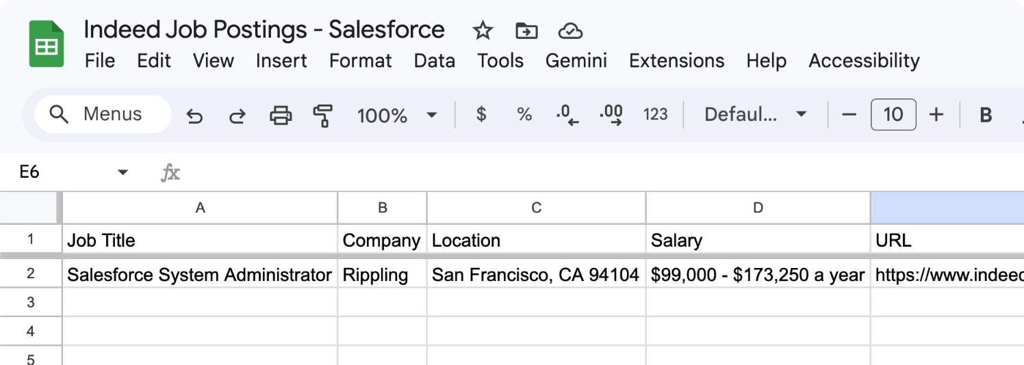 In Google Sheets: Click into the first empty cell in your target row, then hit Cmd+V (Mac) or Ctrl+V (Windows). The data will paste across five columns automatically - Job Title, Company, Location, Salary, and Page URL each land in their own cell. If you're tracking a job search or building a list of target accounts, just keep a running sheet open in a pinned tab and paste after every posting you visit.