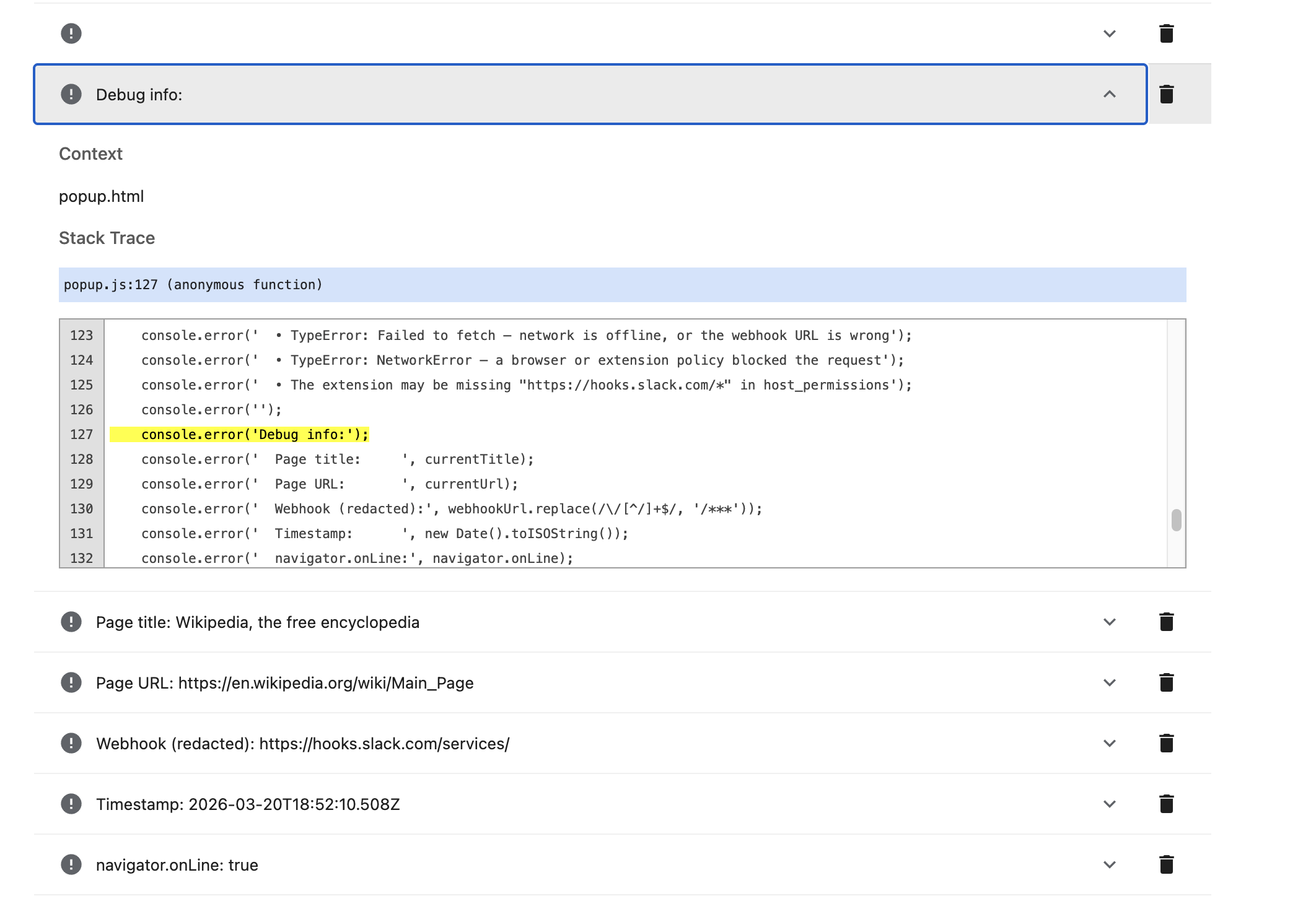 Build me a Chrome extension that sends the current page's title and URL to a Slack channel. Add a button to the browser toolbar. When I click it, it sends the page info to Slack and shows me a confirmation.