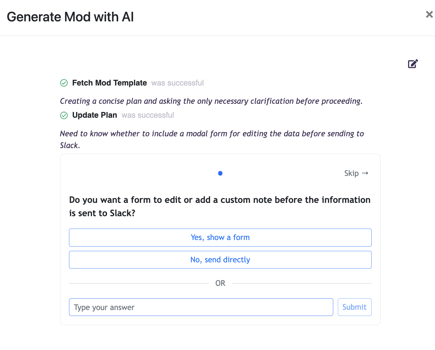 For this use case, you open the PixieBrixAI mod builder, describe what you want, and answer a few questions.