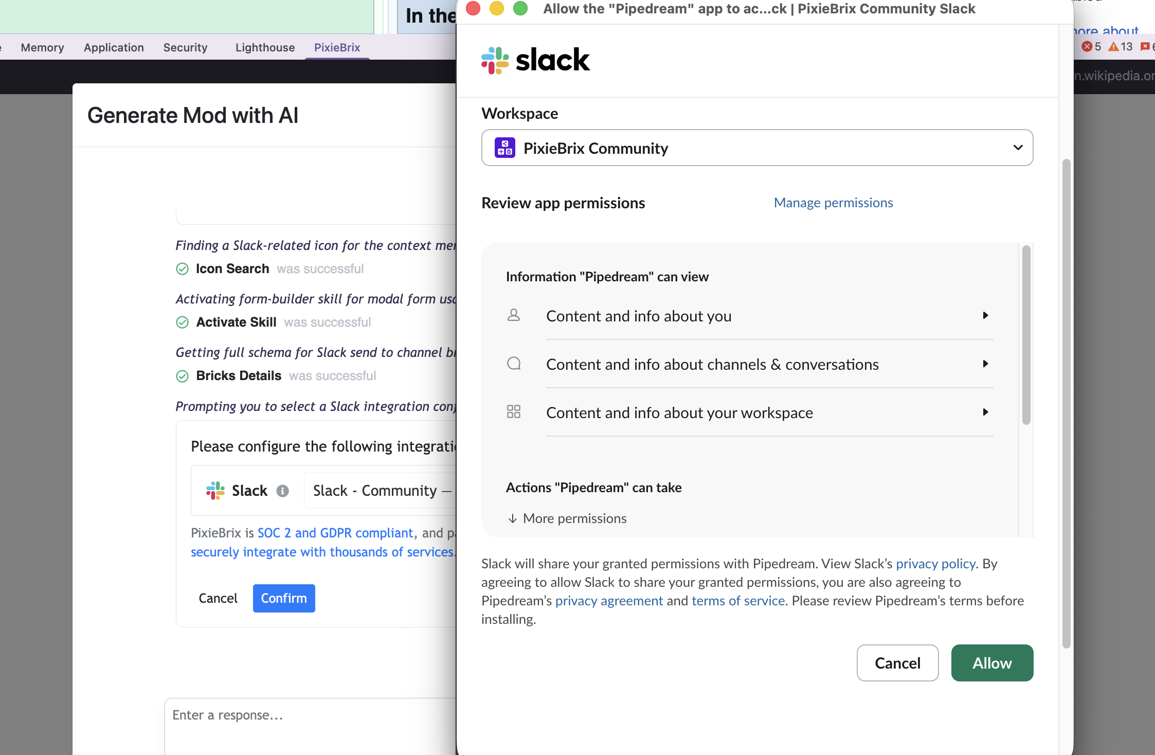 The Slack integration is already solved. PixieBrix has built-in integrations with 3000+ tools. You don't configure a Slack app. You don't generate a webhook. You authenticate the same way you would anytime you add an existing app to slack, just click Approve. The integration is tested and maintained.